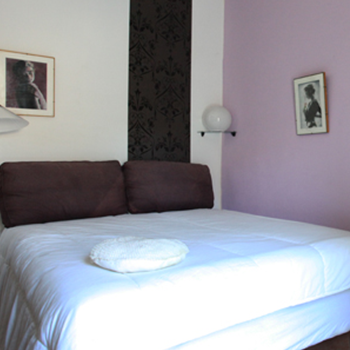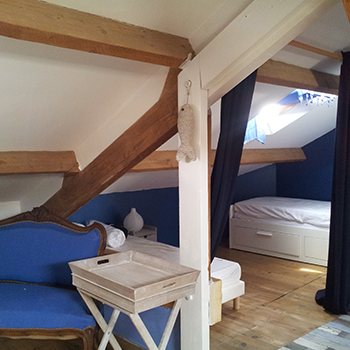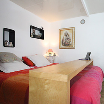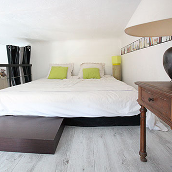 La mezzanine située à l'entrée à droite de la grande maison, comporte un lit double de 160 cm de large, une commode, une penderie… l’endroit ouvert est séparé par des rideaux lourds pour une meilleure isolation phonique et lumineuse.