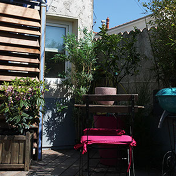 Le petit coin terrasse avec table, chaises et petits endroits pour cultiver,